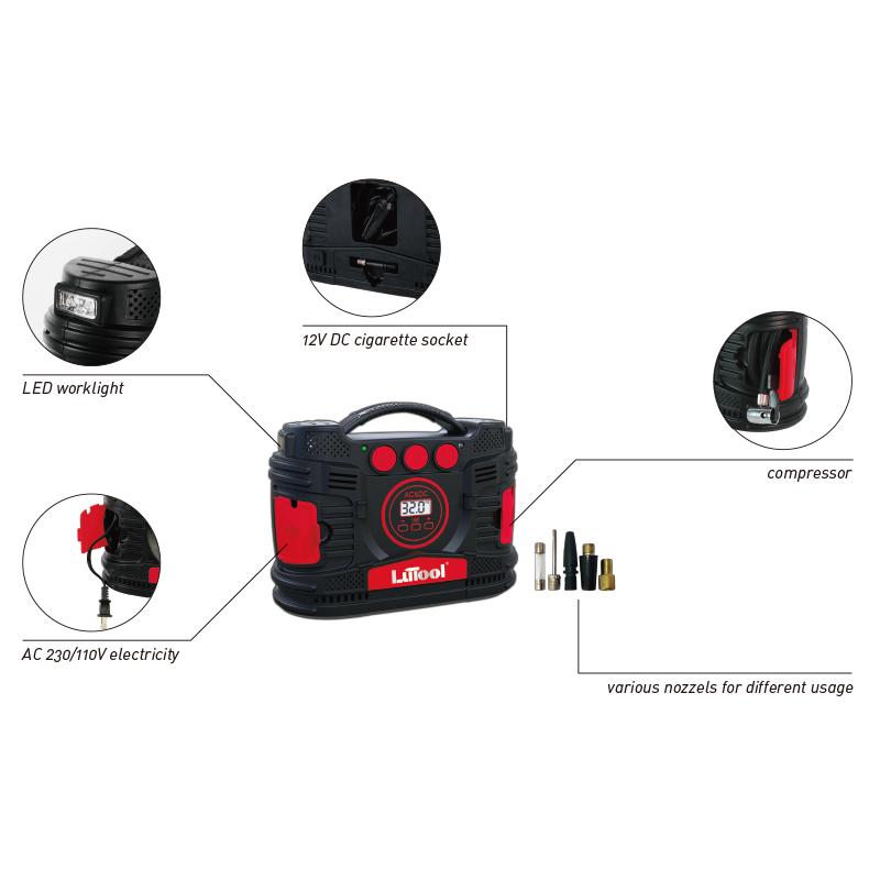 ● 12V DC cigarette socket & AC 230v/110v Air Compressor